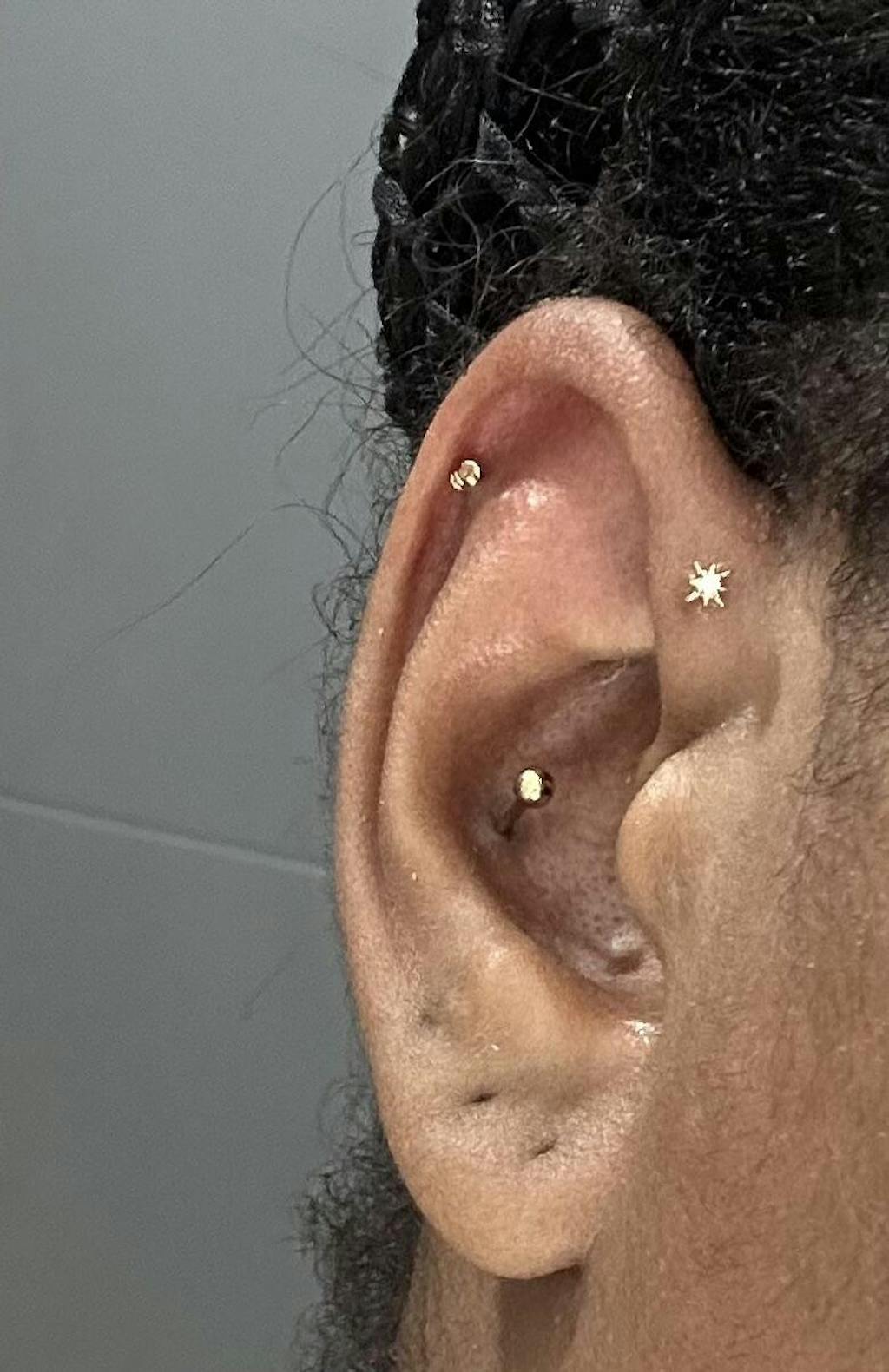 Add a celestial touch to your style with this teeny tiny twinkle star stud. Crafted in 14k gold, this delicate earring features a tiny star with a sparkling white zirconia at its center, bringing just the right amount of shimmer. Designed with an internally threaded flat back, it ensures a secure and comfortable fit for everyday wear. Perfectly sized for cartilage, tragus, helix, conch, upper lobe and nose piercings.